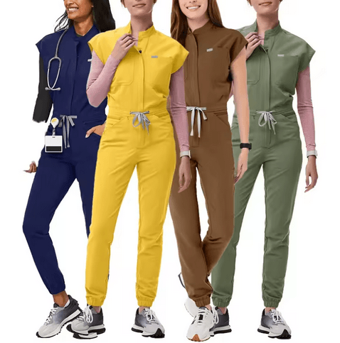 Women Short Sleeve One Piece Scrub Sets Jogger Medical Scrub Jumpsuit Custom Logo with scriptural inscription for Hospital Nurse Uniform. e.g. By His stripes we are healed. (Isaiah 53:5)