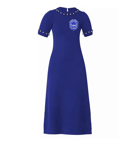 Custom logo with scripture. OEM ODM Manufacturer Pearls Beaded Sorority Women's Dress Knitted Long Dress. e,g. She is clothed with strength and dignity. (Proverbs 31:25)