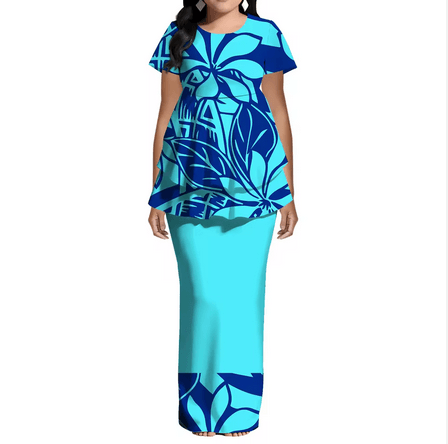Blue Puletasi Frill Long Dress Custom logo and scripture. Hawaii Style Design Short Sleeve Dress Polynesian Tribal Ladies Dress 2 Piece. e.g God is within her, she will not fall. (Psalm 46:5)
